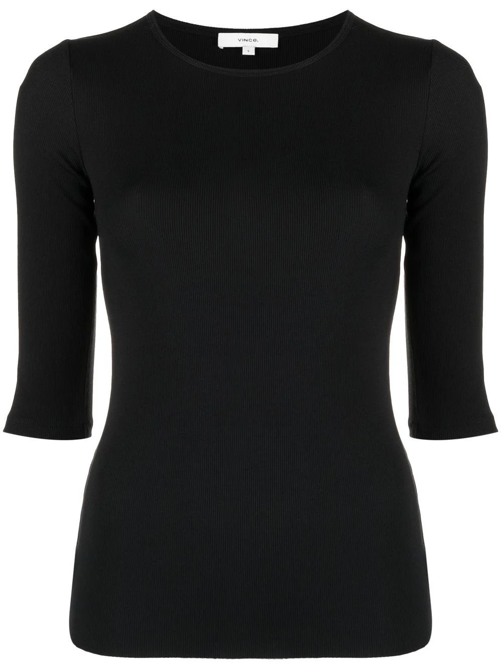 fine-ribbed top Vince displays its ability to produce effortlessly tasteful wardrobe staples. Presented in a sleek black hue, the half-length sleeves give this piece a contemporary feel, while the ribbed construction lends a textural finish. Highlights - Black - Stretch-design - Fine ribbed - Round neck - Half-length sleeves - Straight hem Imported Composition Modal 91%, Spandex/Elastane 9% SIZE & FIT Model measurements Height 5 ft 11 in(1.8 m) Bust/Chest 31.49 in(80 cm) Hips 35.43 in(90 cm) Waist 25.19 in(64 cm) FittingInformation This piece fits true to size. We recommend you get your regular size Cut for a slim fit Made with a mid-weight stretch fabric Washing instructions Machine Wash
