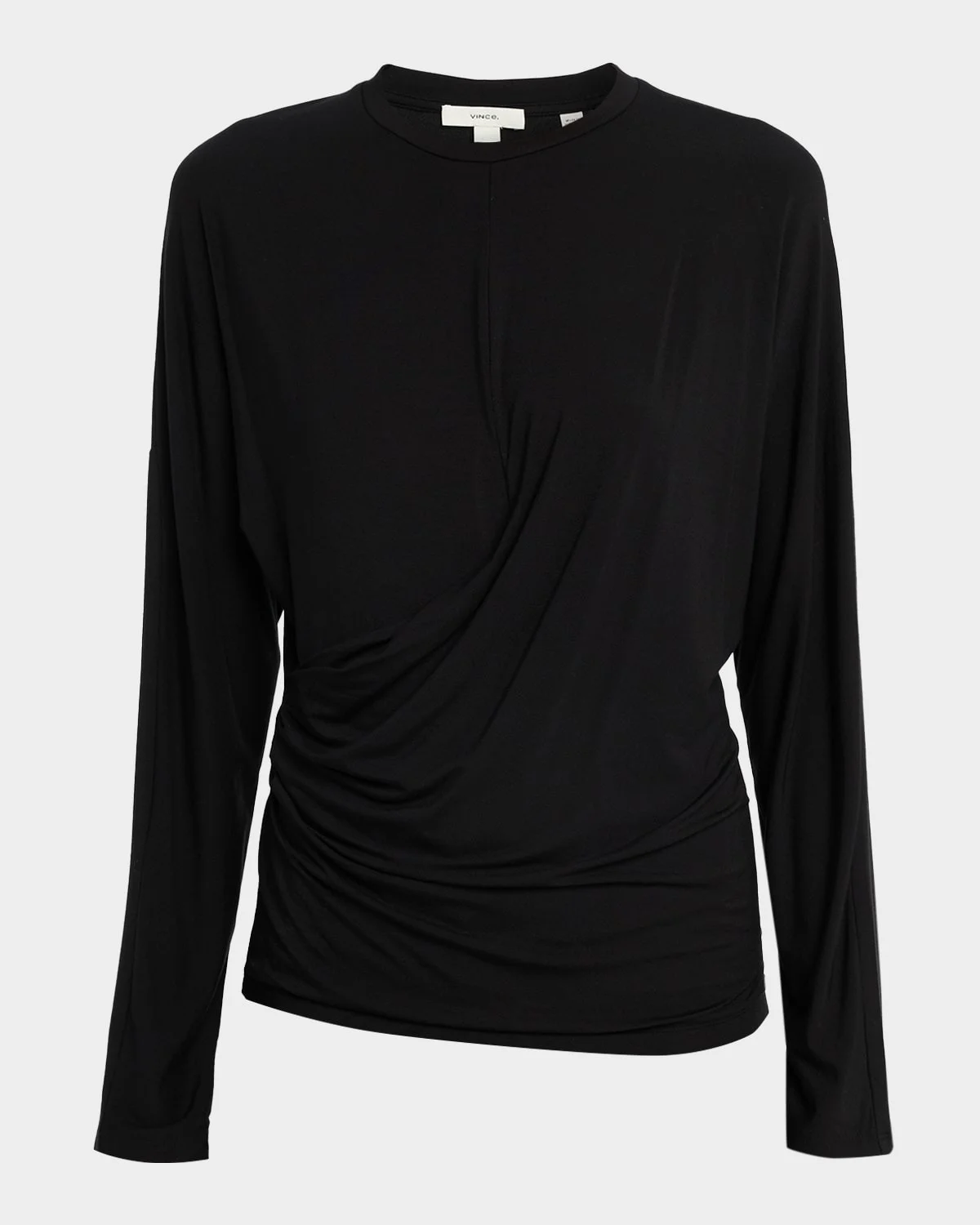Vince blouse elevated with a soft draped detail at the waist. Crew neckline Dropped shoulders Long sleeves Relaxed fit Hem sits at the hip Pullover style Rayon/cellulose acetate/spandex Dry clean or machine wash cold Imported