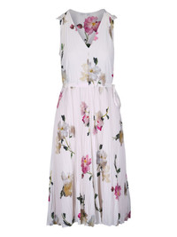 floral-print pleated dress Highlights - White - Floral pattern - V-neck - Self-tie belt - Sleeveless - Mid length Imported Composition Lining: Polyester 100% Outer: Polyester 100% Washing instructions Hand Wash