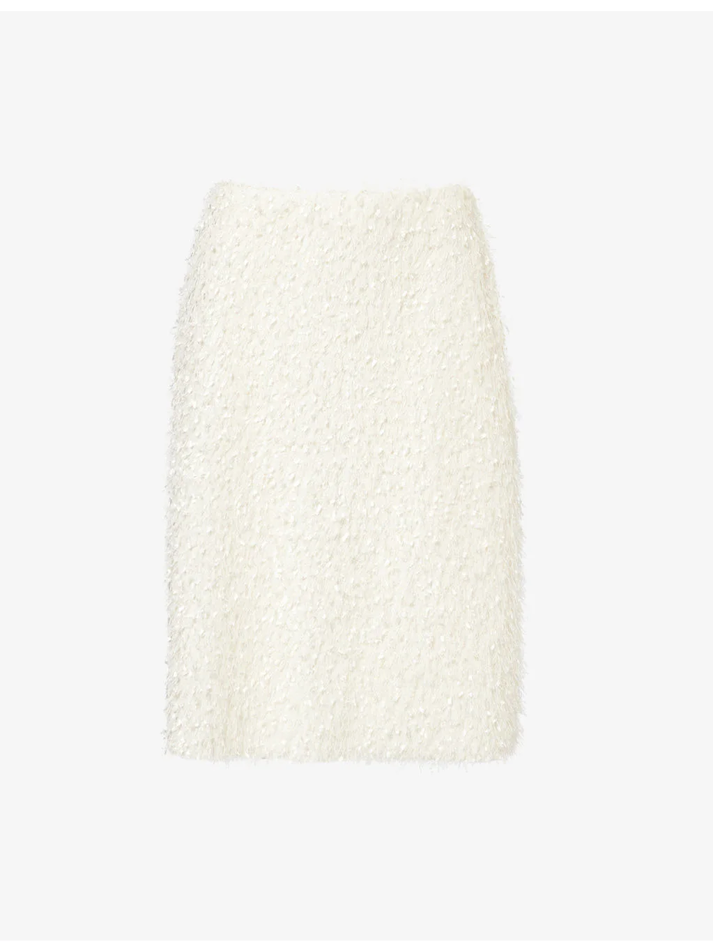 PRODUCT DETAILS - Vince. woven midi skirt - 100% polyester - Regular fit, mid-rise, elasticated waistband, all-over fringe texture - Dry clean only - True to size - Size UK 6: length 24in / 61cm - Model is 5ft 10in/1.78m and wears a size UK 6 - Lightweight, slight stretch Ref: R04552335