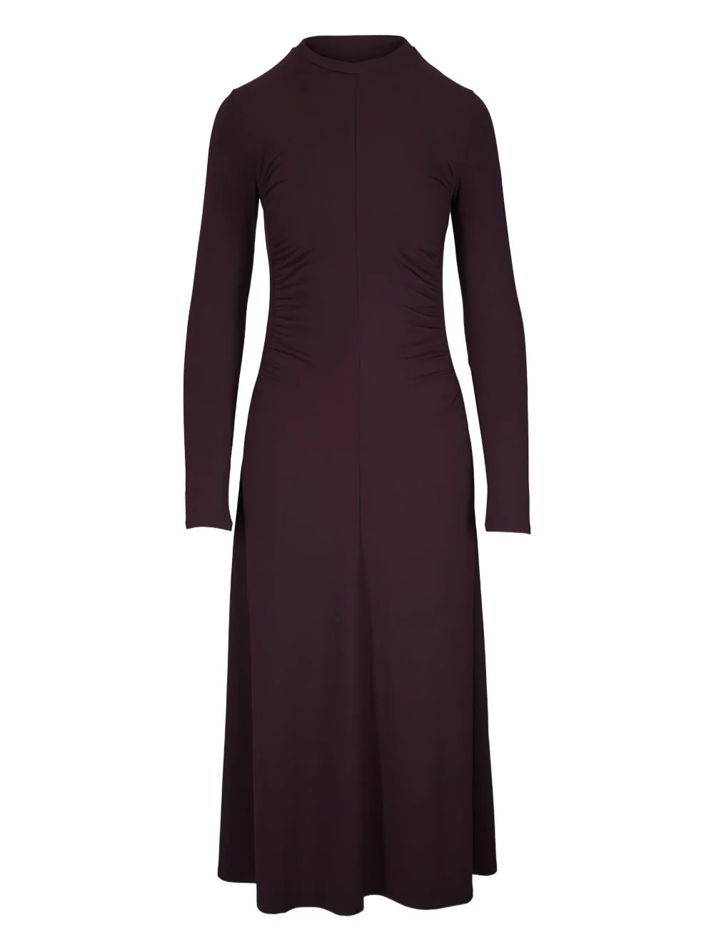 gathered midi dress Highlights - Dark purple - Round neck - Long sleeves - Side gathering - Mid-length Made in United States Composition Rayon 91%, Spandex/Elastane 9% Washing instructions Read Manufacturer Guidelines