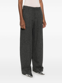 herringbone trousers Highlights - Charcoal grey - Concealed front button, hook and zip fastening - Two diagonal pockets to the sides - Two rear flap pockets Imported Composition Wool 38%, Polyester 30%, Rayon 30%, Nylon 1%, Spandex/Elastane 1% SIZE & FIT Model measurements Height 5 ft 10 in(1.78 m) Bust/Chest 31.49 in(80 cm) Hips 37 in(94 cm) Waist 23.62 in(60 cm) FittingInformation Designed with a wide-leg cut, these trousers allow for a close fit at the waist and offer a loose and roomy fit over the leg The partially elasticated waistband offers increased movement and comfort at the waist Made from a midweight non-stretch fabric