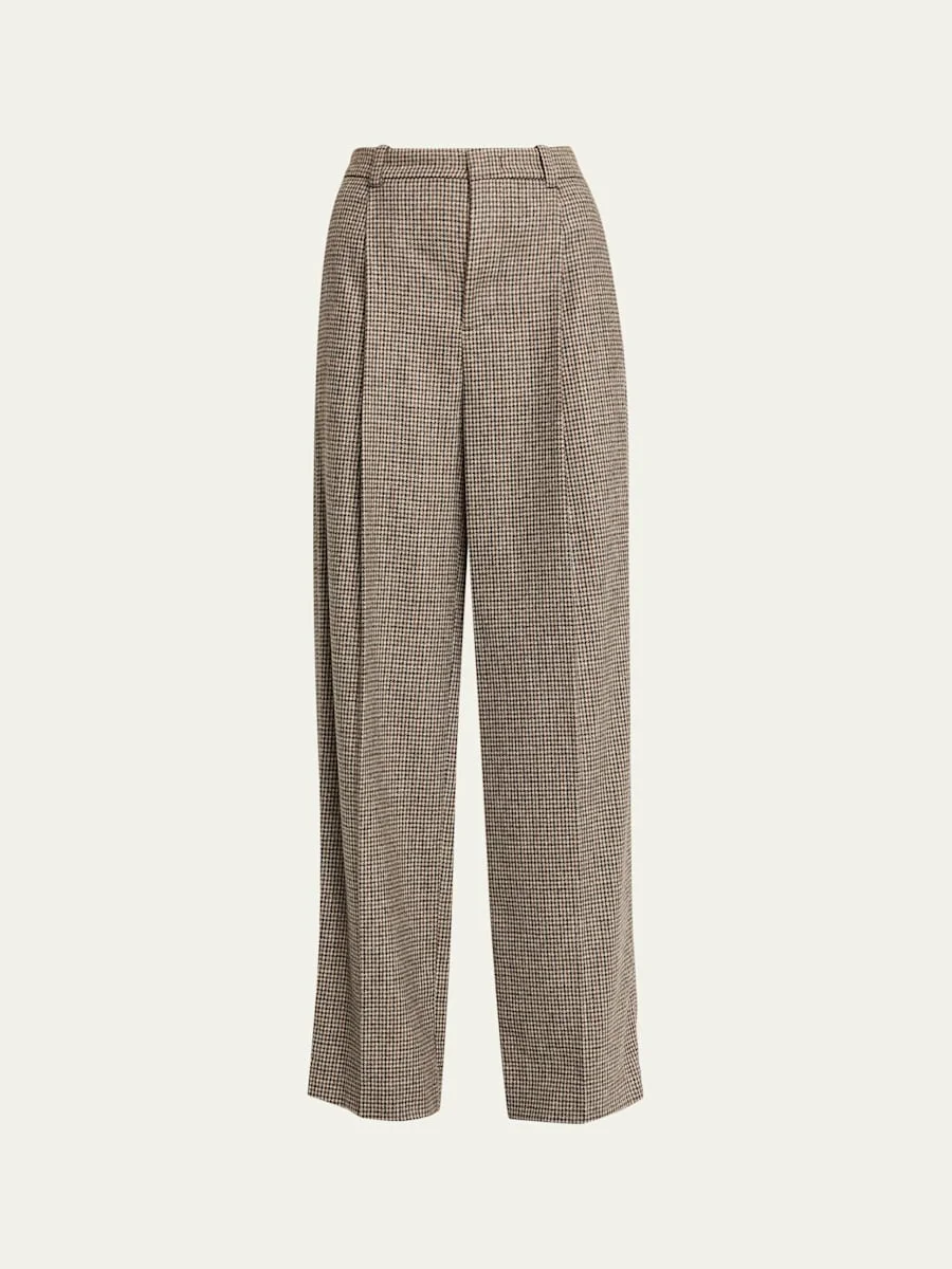 Houndstooth trousers crafted from a soft woolblend by Vince. Approx. 12" rise; 32.5" inseam High rise Pleated front Fourpocket style Wide legs Full length Hook/zip fly; belt loops Wool/polyester/viscose Dry clean Imported