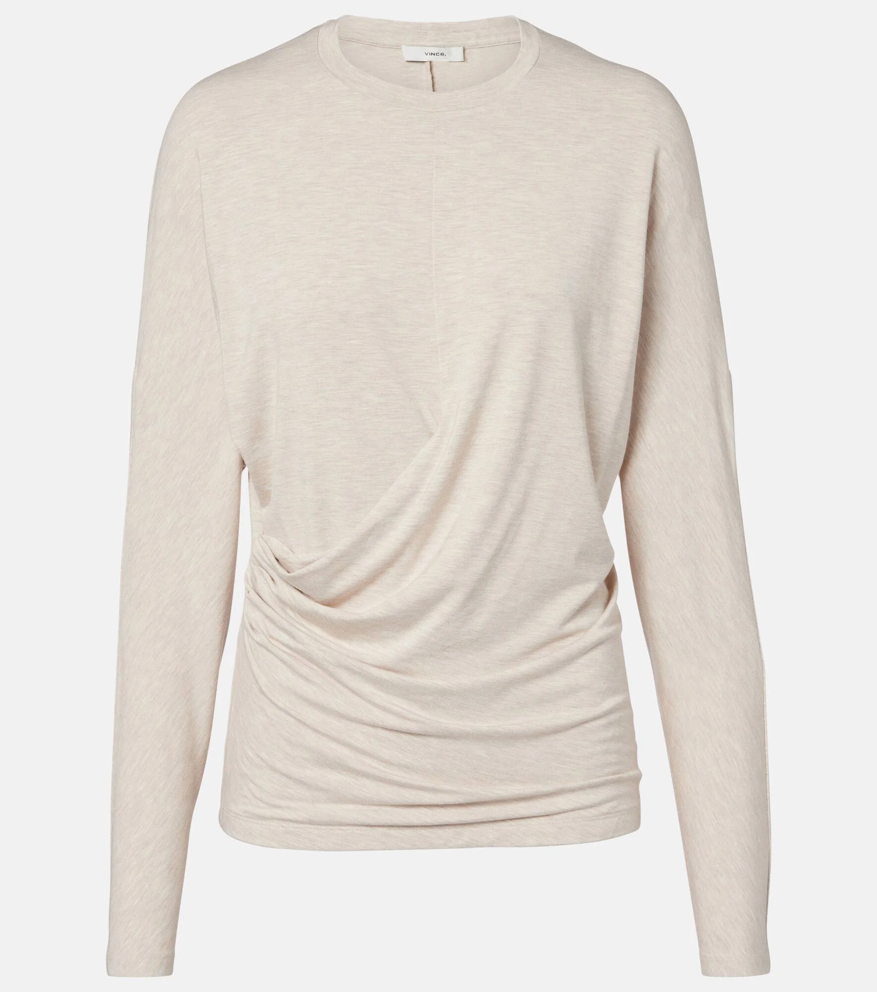 Look to Vince when building a timeless wardrobe of elevated yet understated styles. This long-sleeved top is crafted from jersey and features a cinched waist. Product Details - Material: 90% rayon, 10% elastane - Care instructions: machine wash cold - Made in Indonesia - Designer color name: H Cream Oat - Item color: beige - Item number: P01123953 Size & Fit - True to size - Cinched waist - Stretchy fabric - Falls to the hip - The model seen in the picture is 178cm-5'10" and wearing a size XS