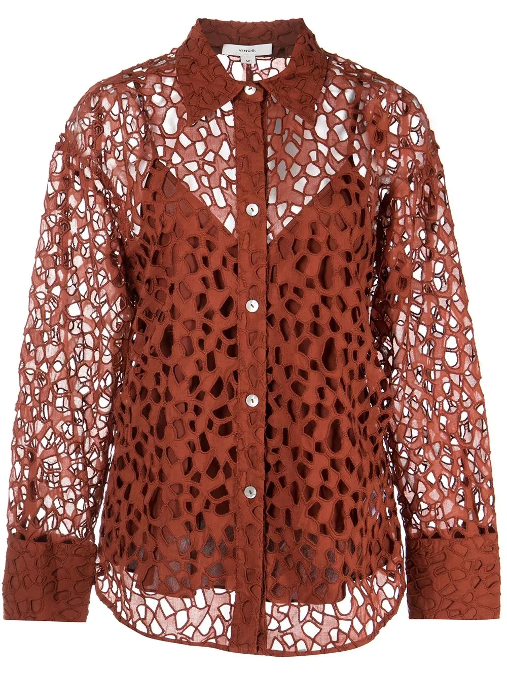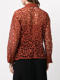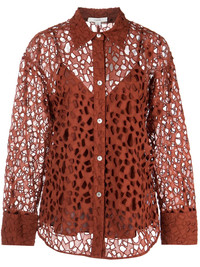 lace-detail cotton blouse rust amber brown cotton lace detailing front button fastening pointed flat collar long sleeves curved hem Imported Composition Cotton 100% SIZE & FIT Model measurements Height 5 ft 10 in(1.79 m) Bust/Chest 29.92 in(76 cm) Hips 34.25 in(87 cm) Waist 24.01 in(61 cm) Measurement CHEST 33.85 in(86 cm) HIPS 38.58 in(98 cm) FittingInformation This piece fits true to size. We recommend you get your regular size Cut for a loose fit. Comes with a slim-fitting slip Made with a lightweight fabric Washing instructions Dry Clean Only