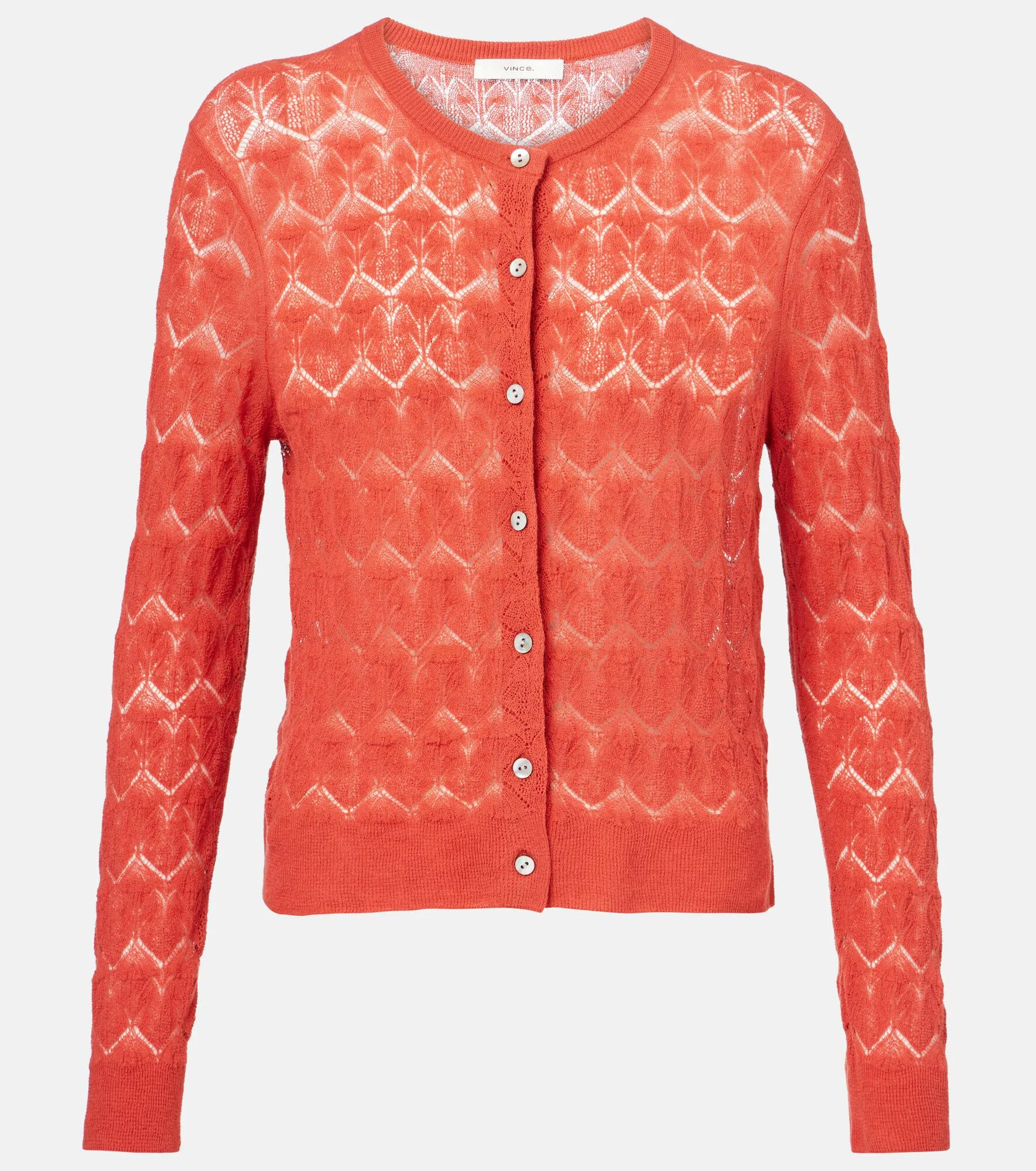 Light and lacy, this delicate cardigan in pure cotton from Vince showcases the brand's timeless elegance. The pointelle-knit creates a sophisticated semi-sheer effect. Product Details - Material: 100% cotton - Care instructions: dry clean - Made in China - Designer color name: Terra - Item color: orange - Slim fit - Length: regular (hip-length) - Closure: buttoned front - Hem: straight - Sleeves: long-sleeved - Item number: P01058893 Size & Fit - True to size - Semi-sheer - Straight fit - Stretchy fabric - Slightly cropped - The model seen in the picture is 178cm-5'10" and wearing a size XS