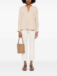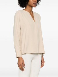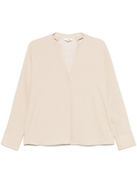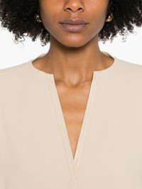 faux leather-trim blouse Highlights - Light beige - Buttoned cuffs - Round split neck - Pleat detailing Imported Composition Polyester 100% SIZE & FIT Model measurements Height 5 ft 11 in(1.8 m) Bust/Chest 32.67 in(83 cm) Hips 35.82 in(91 cm) Waist 25.98 in(66 cm) FittingInformation Designed to be unstructured, offering a loose fit throughout Made from a midweight non-stretch fabric