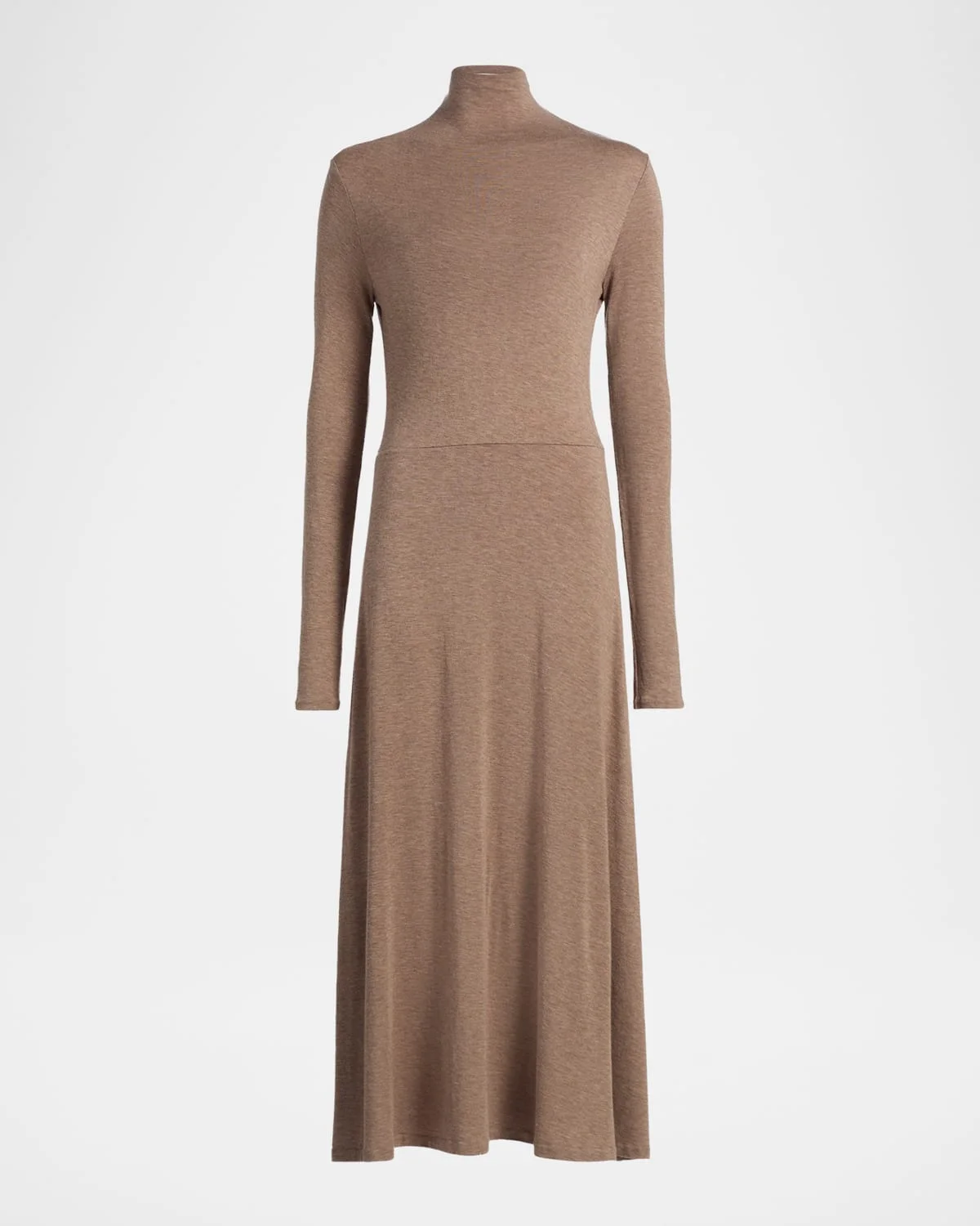Soft jersey midi dress by Vince. Funnel neckline Long sleeves Slim silhouette Hem falls below the knee Slipover style Lyocell/nylon/polyamide Hand wash or dry clean Imported