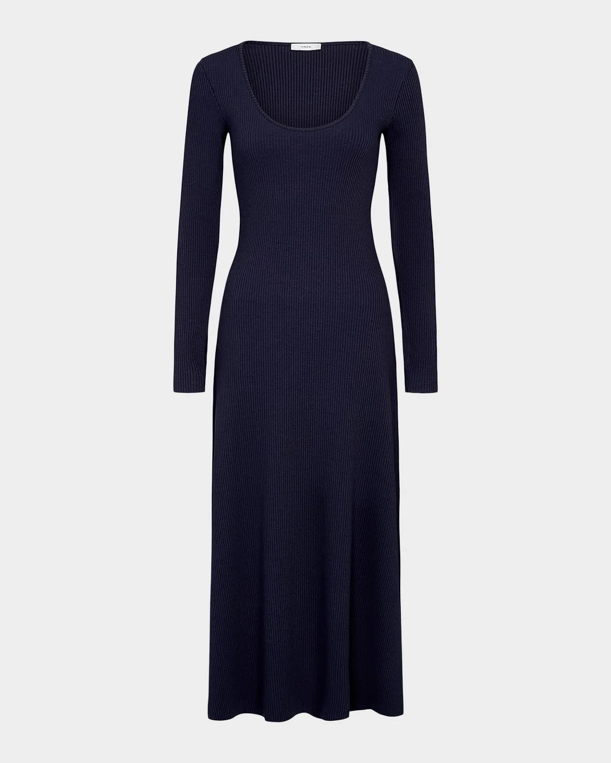 Crafted from a heavyweight ribbed knit, this Vince midi dress boasts a flared, A-line silhouette & nbsp;with a luxurious hand-feel. Scoop neckline Long sleeves Hem falls below the knee Slipover style & nbsp; Cotton/polyester/spandex Dry clean or machine wash cold Imported