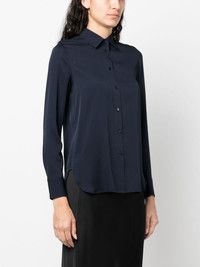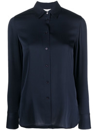 classic collar shirt Navy silk classic collar shirt from Vince featuring a front button fastening, a classic collar, long sleeves, button cuffs, a relaxed shape and a straight hem. Imported Composition Silk 92%, Spandex/Elastane 8% SIZE & FIT Model measurements Height 5 ft 9 in(1.75 m) Bust/Chest 33.07 in(84 cm) Hips 35.03 in(89 cm) Waist 24.01 in(61 cm) Measurement CHEST 42.51 in(108 cm) LENGTH 25.98 in(66 cm) WAIST 40.94 in(104 cm) SLEEVE LENGTH 20.47 in(52 cm) HIPS 43.3 in(110 cm) FittingInformation Designed to be unstructured, offering a loose fit throughout Constructed with narrow shoulders Made from a lightweight stretch fabric, this piece offers elasticity and flexibility when worn This piece fits true to size – those with broad shoulders may wish to take one size up Washing instructions Hand Wash