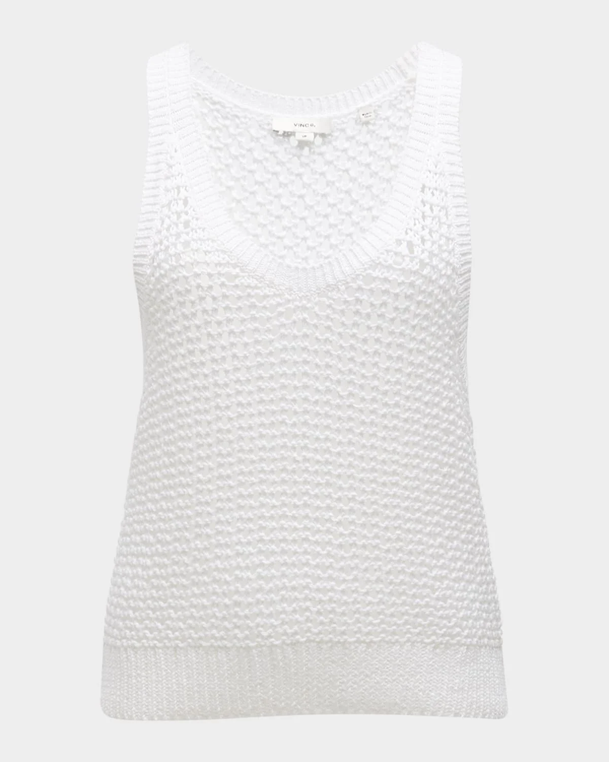 Vince stitched tank top complete with ribknit trim Scoop neckline Sleeveless Slim fit Hip length Pullover style Cotton Hand wash or dry clean Imported
