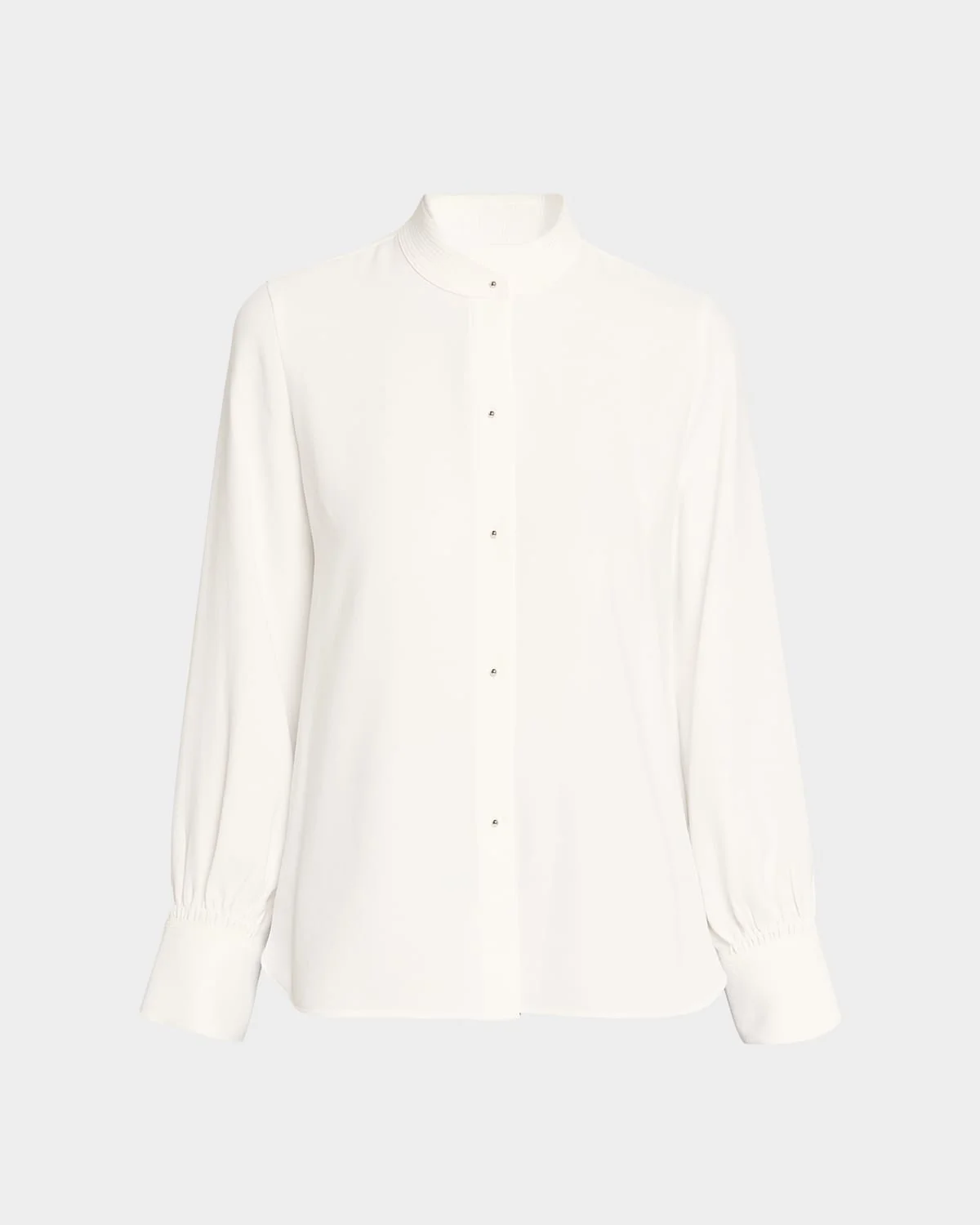 Matte crepe shirt adorned with metal ball buttons by Vince. Stand collar Long sleeves with button cuffs Classic fit Hem falls to the hip Buttonfront Polyester Dry clean Imported
