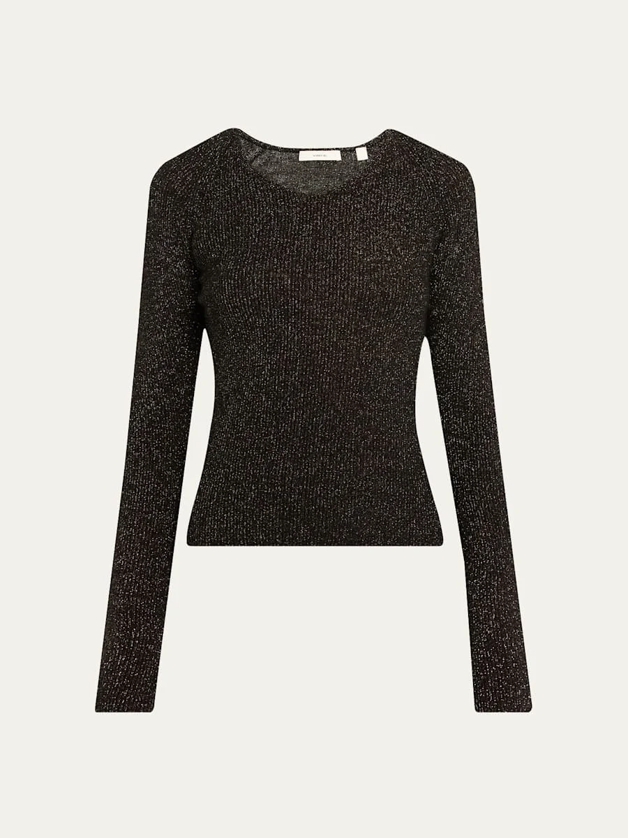 Soft ribbed sweater with metallic threading by Vince. High V neckline Long sleeves Slim fit Hem sits at the hip Pullover style Nylon/polyamide/wool/animal hair Dry clean or hand wash Imported