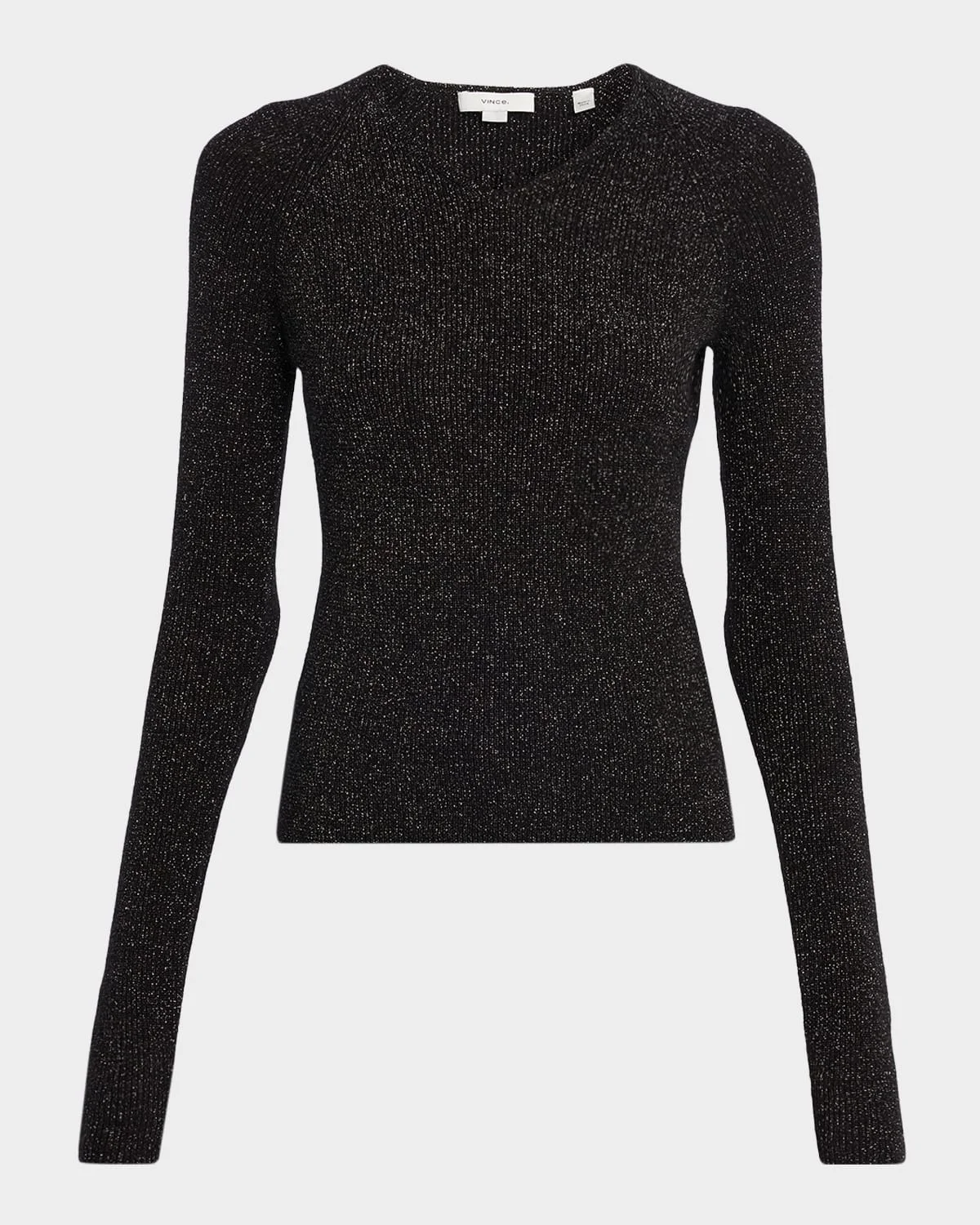 Soft ribbed sweater with metallic threading by Vince. High V neckline Long sleeves Slim fit Hem sits at the hip Pullover style Nylon/polyamide/wool/animal hair Dry clean or hand wash Imported