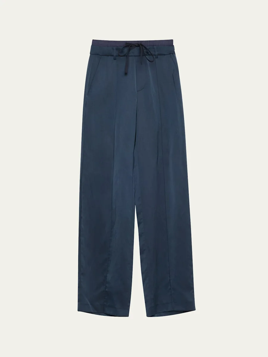 Vince satin pants featuring a double-waistband Mid-rise; sits high on the hip Drawstring waist Four-pocket style Wide legs Full length Invisible side zip Polyester/viscose/flax Dry clean or machine wash cold Imported Online Inquiries: BGS21_T8WBN| Store Inquiries: #4957715