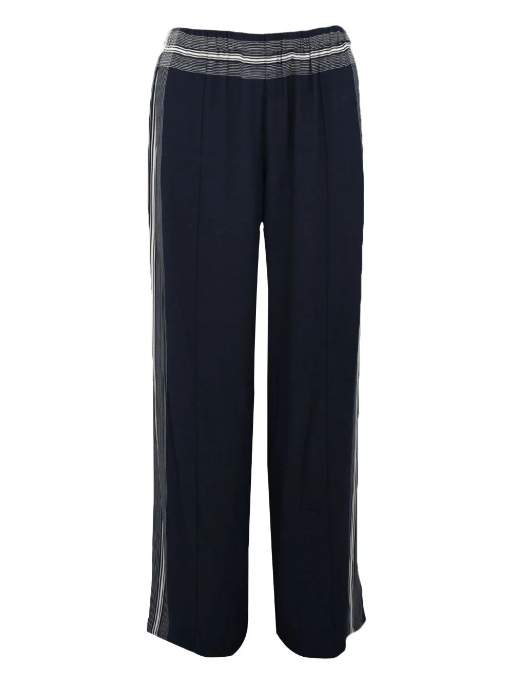 elasticated-waist trousers Highlights - Navy blue - Side stripes - Elasticated waistband - Two back pockets Imported Composition Viscose 58%, EcoVero Viscose (LENZING) 42% Washing instructions Read Manufacturer Guidelines