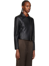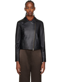 Insulated lambskin leather jacket. · Spread collar · Asymmetric two-way zip closure · Seam pockets at waist · Stretch jersey panels at arms · Welt pocket at interior · Quilted satin lining in tan Supplier color: Black