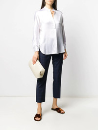 open neck loose fit blouse Highlights - White - Silk - Round neck - Long sleeves - Curved hem - Loose fit Imported Composition Silk 100% SIZE & FIT Model measurements Height 5 ft 10 in(1.78 m) Bust/Chest 31.49 in(80 cm) Hips 36.22 in(92 cm) Waist 25.59 in(65 cm) Measurement BUST 41.33 in(105 cm) LENGTH 27.16 in(69 cm) Washing instructions Hand Wash