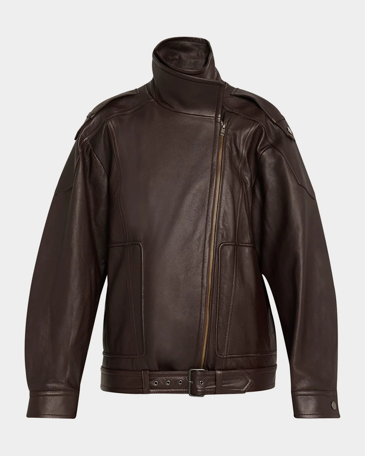 Genuine leather aviator jacket by Vince. Notch collar; asymmetric zipfront Epaulets Long sleeves with snap cuffs Patch pockets Oversized fit Adjustable belted hem Leather Lining: Polyester Professional cleaning recommended Imported