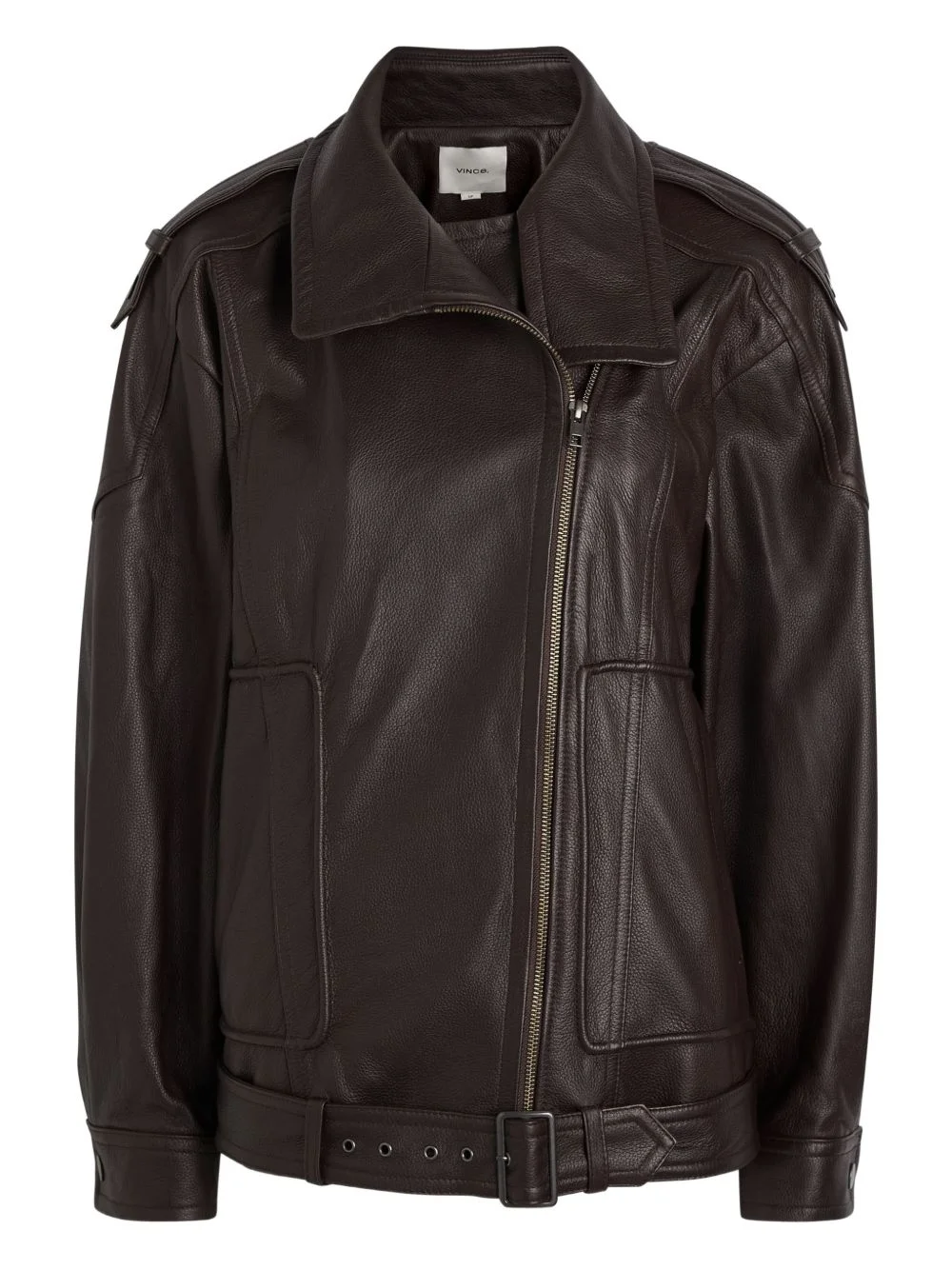 panelled grained leather jacket Highlights - Dark coffee - Zip fastening - Oversized - Epaulettes - Belt - Slip pockets Imported Composition Lambskin 100% Washing instructions Read Manufacturer Guidelines