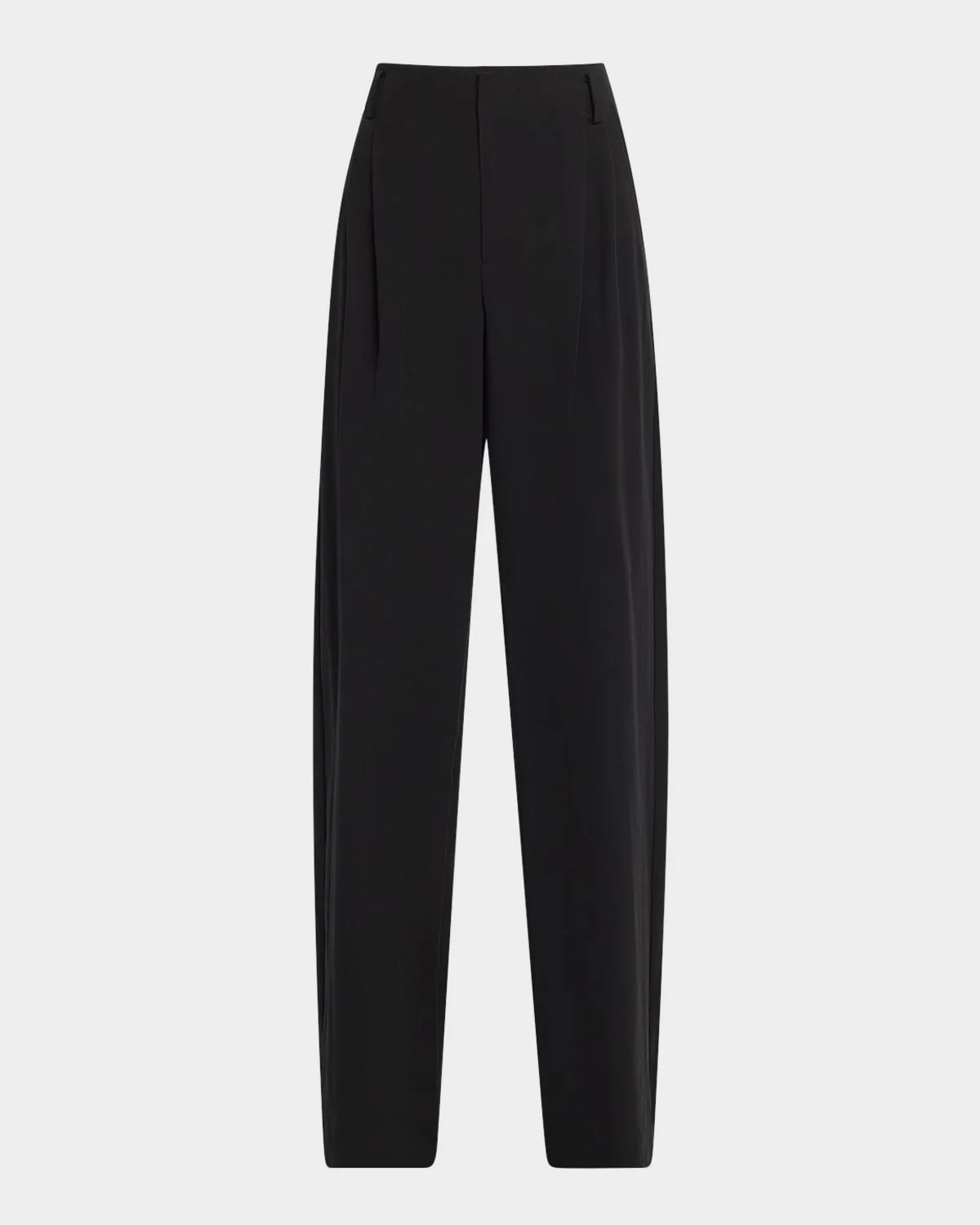 - Vince pleated trousers - Approx. 32.5" inseam - High rise - Four-pocket style - Wide legs - Full length - Button/zip fly; belt loops - Cotton/nylon/polyamide - Hand wash cold or dry clean - Imported