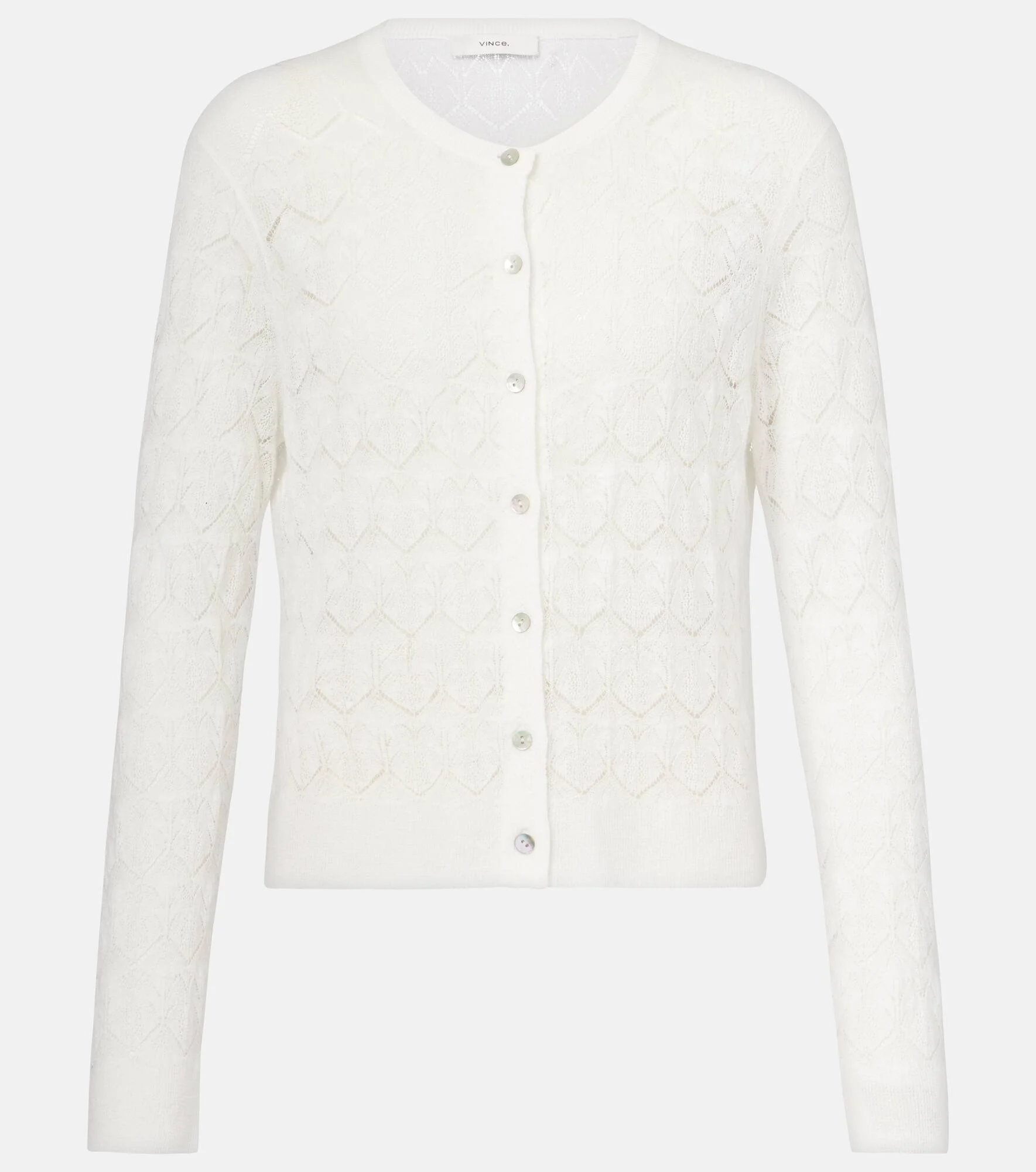 This delicate cardigan in pure cotton from Vince showcases the brand's timeless elegance. The pointelle-knit creates a sophisticated semi-sheer effect. Product Details - Material: 100% cotton - Care instructions: dry clean - Made in China - Designer color name: Optic White - Item color: white - Slim fit - Length: short (waist-length) - Closure: button-down - Sleeves: long-sleeved, set-in - Collar: crewneck - Cuff: ribbed - Hem: ribbed - Item number: P01058892 Size & Fit - True to size - Semi-sheer - Straight fit - Stretchy fabric - Slightly cropped - The model seen in the picture is 178cm-5'10" and wearing a size XS