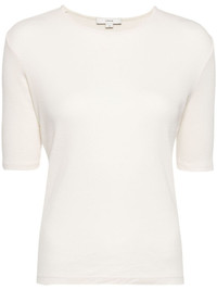 cotton ribbed T-shirt Highlights - White - Cotton - Fine ribbed - Crew neck - Short sleeves - Straight hem Imported Composition Cotton 100% SIZE & FIT Model measurements Height 5 ft 10 in(1.77 m) Bust/Chest 31.49 in(80 cm) Hips 35.43 in(90 cm) Waist 25.19 in(64 cm) FittingInformation Designed for a slim fit that sits just away from the body offering a close yet comfortable fit Made from a midweight non-stretch fabric, this piece offers minimal elasticity when worn