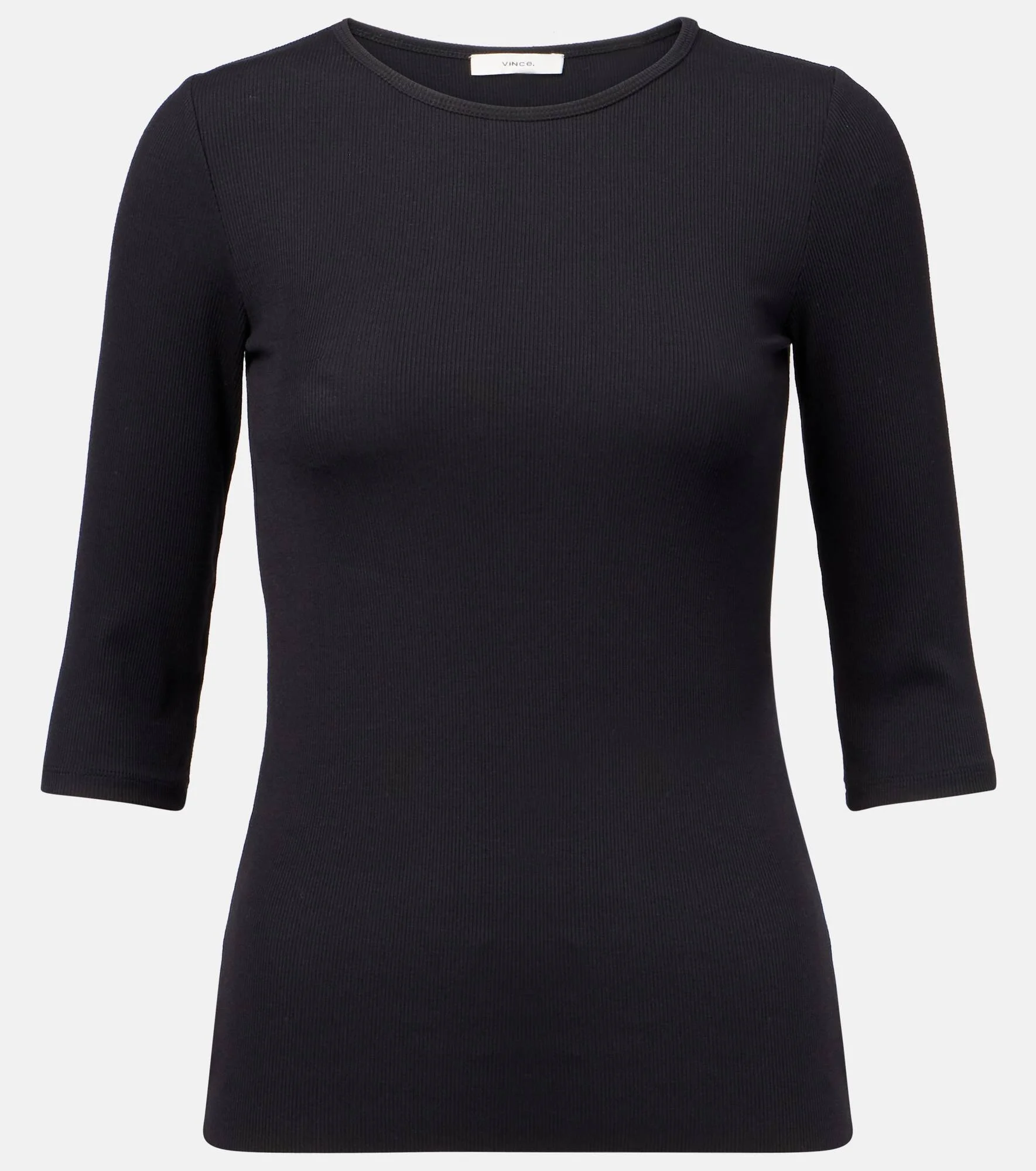 This ribbed-knit top features three-quarter sleeves and a fine, lightweight handle. Perfect for layering or wearing solo. Look to Vince when building a timeless wardrobe of elevated yet understated styles. Product Details - Material: 85% modal, 15% elastane - Care instructions: machine wash cold - Made in China - Designer color name: Black - Item color: black - Item number: P01058960 Size & Fit - True to size - Cinched waist - Stretchy fabric - Falls to the hip - The model seen in the picture is 178cm-5'10" and wearing a size XS