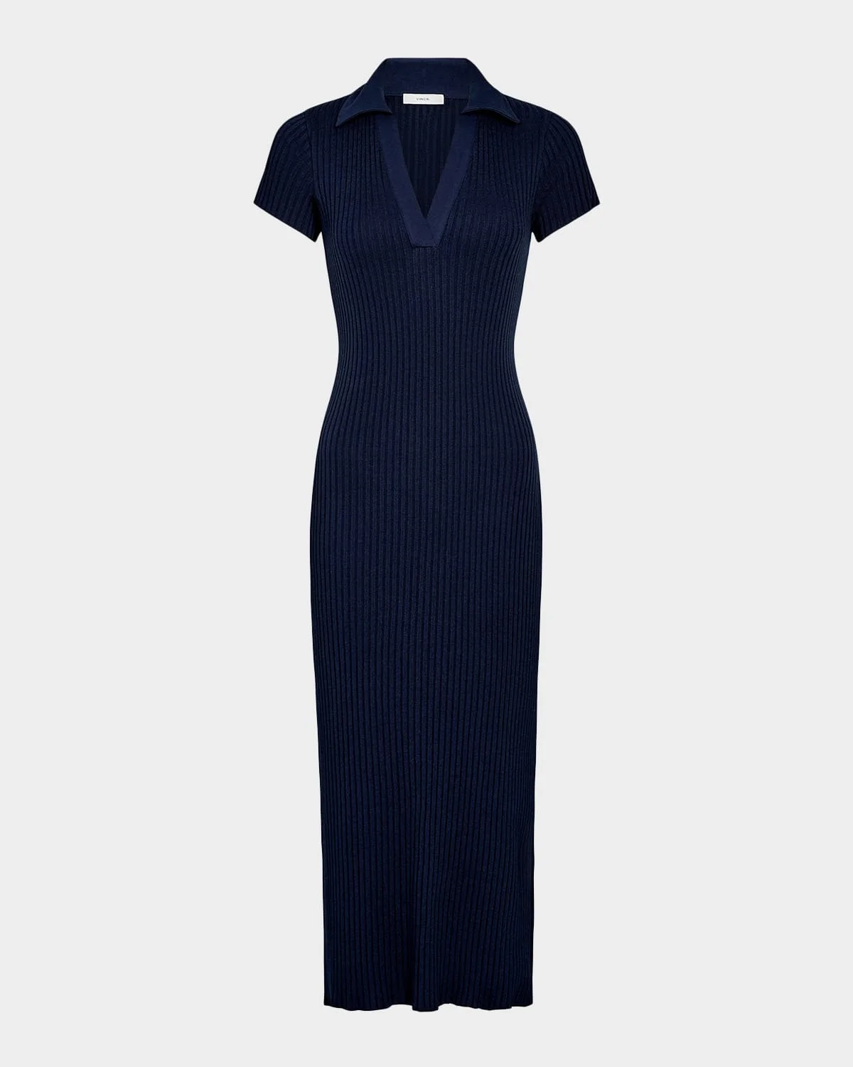 Vince polo-style dress crafted from an ultra-soft ribbed knit & nbsp; Spread collar; V neckline Short sleeves Slim silhouette Hem falls below the knee & nbsp; Side slits & nbsp; Slipover style & nbsp; Cotton/polyester/spandex Hand wash Imported SIZE & FITModel measurements: 5 & apos;10" tallModel is wearing a US size 4/Small