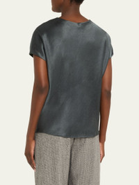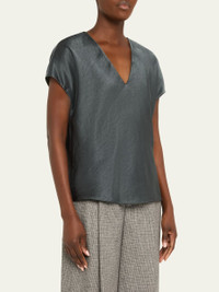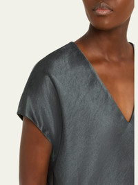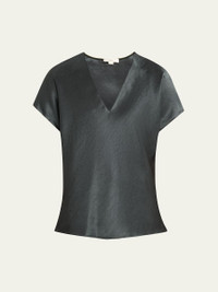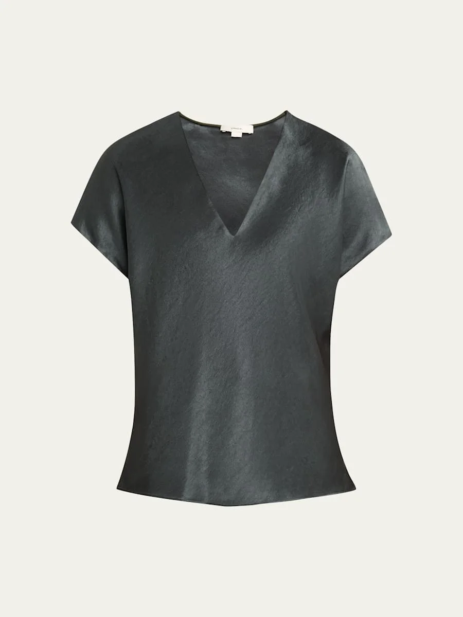 Refined blouse in luxe satin by Vince. V neckline Short sleeves Slim fit Hem falls to the hip Pullover style Polyester Machine wash cold or dry clean Imported