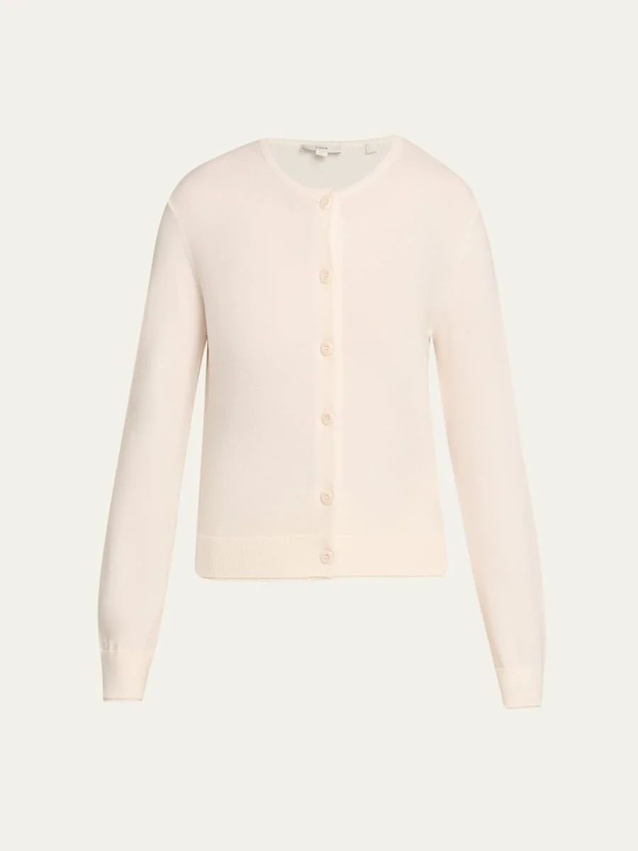 Vince ultrasoft knit cardigan finished with delicate scalloped trim Crew neckline Long sleeves Classic fit Hem sits at the hip Buttonfront Polyester/nylon/polyamide/spandex Hand wash Made in Peru SIZE amp; FITModel measurements: 5'10" tall Model is wearing a US size 4/Small