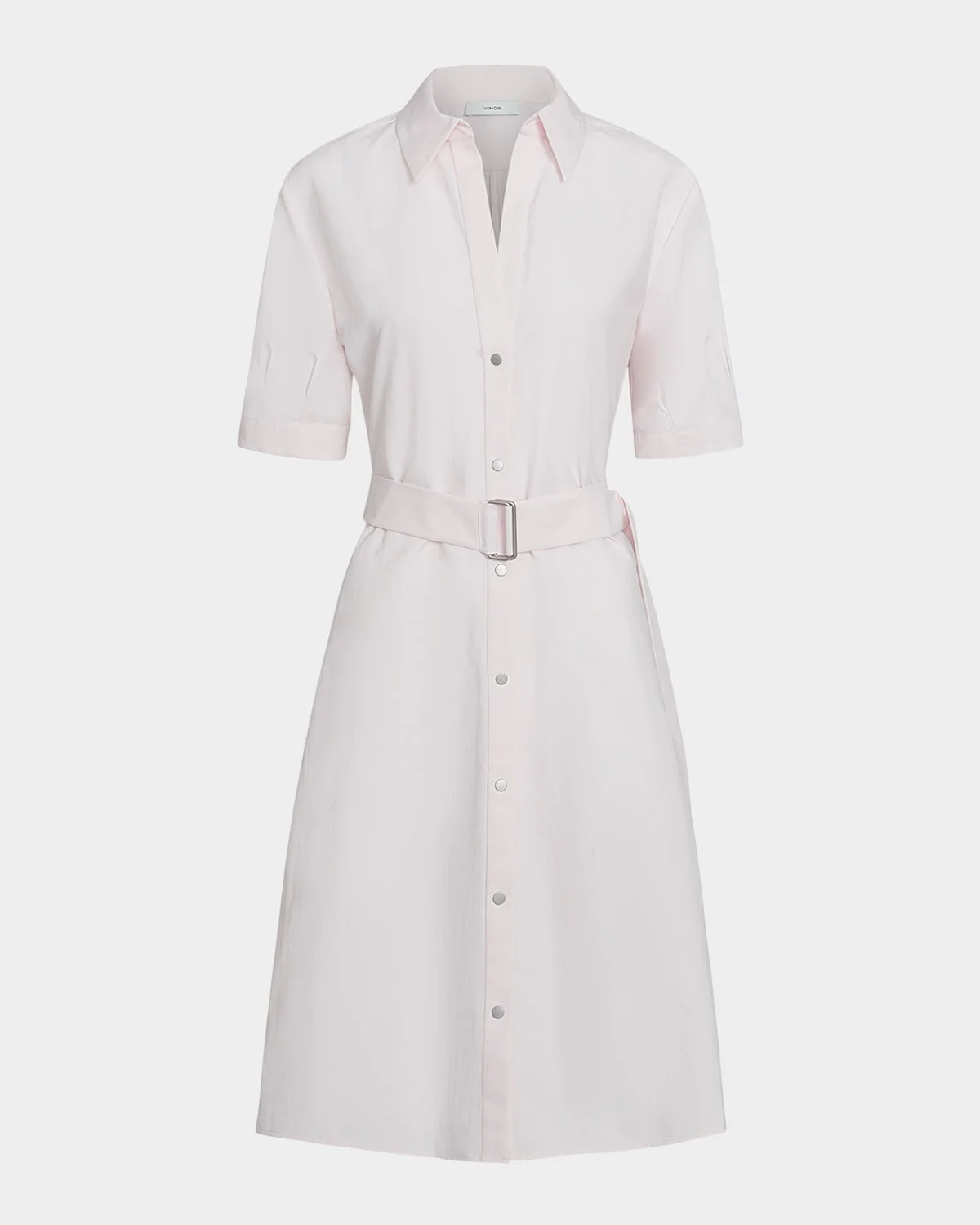 - Vince midi dress featuring an adjustable belted waist - Point collar; V neckline - Cuffed short sleeves - Shirtdress silhouette - Hem hits around the knee - Button-front - Tencel® lyocell/nylon/polyamide - Hand wash or dry clean - Imported - Shipping - Direct from Vendor, usually ships within 10 business days.