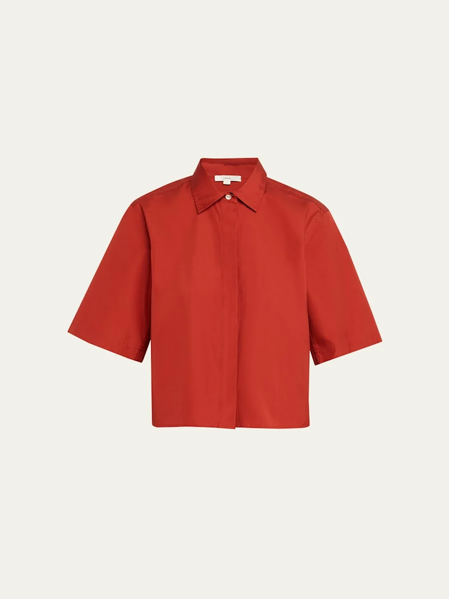 Vince crop shirt punctuated by motherofpearl buttons Approx. 22.1"L from shoulder to hem Spread collar; hidden button placket Short sleeves Yoked back Hip length Boxy fit Cotton Imported