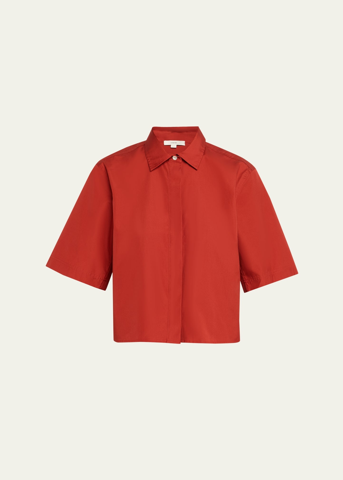 Vince crop shirt punctuated by mother-of-pearl buttons Approx. 22.1”L from shoulder to hem Spread collar; hidden button placket Short sleeves Yoked back Hip length Boxy fit Cotton Imported Model is 5'10"/177cm. Online Inquiries: BGS21_T6VYZ| Store Inquiries: #4791166