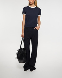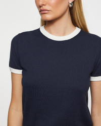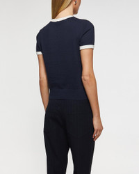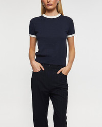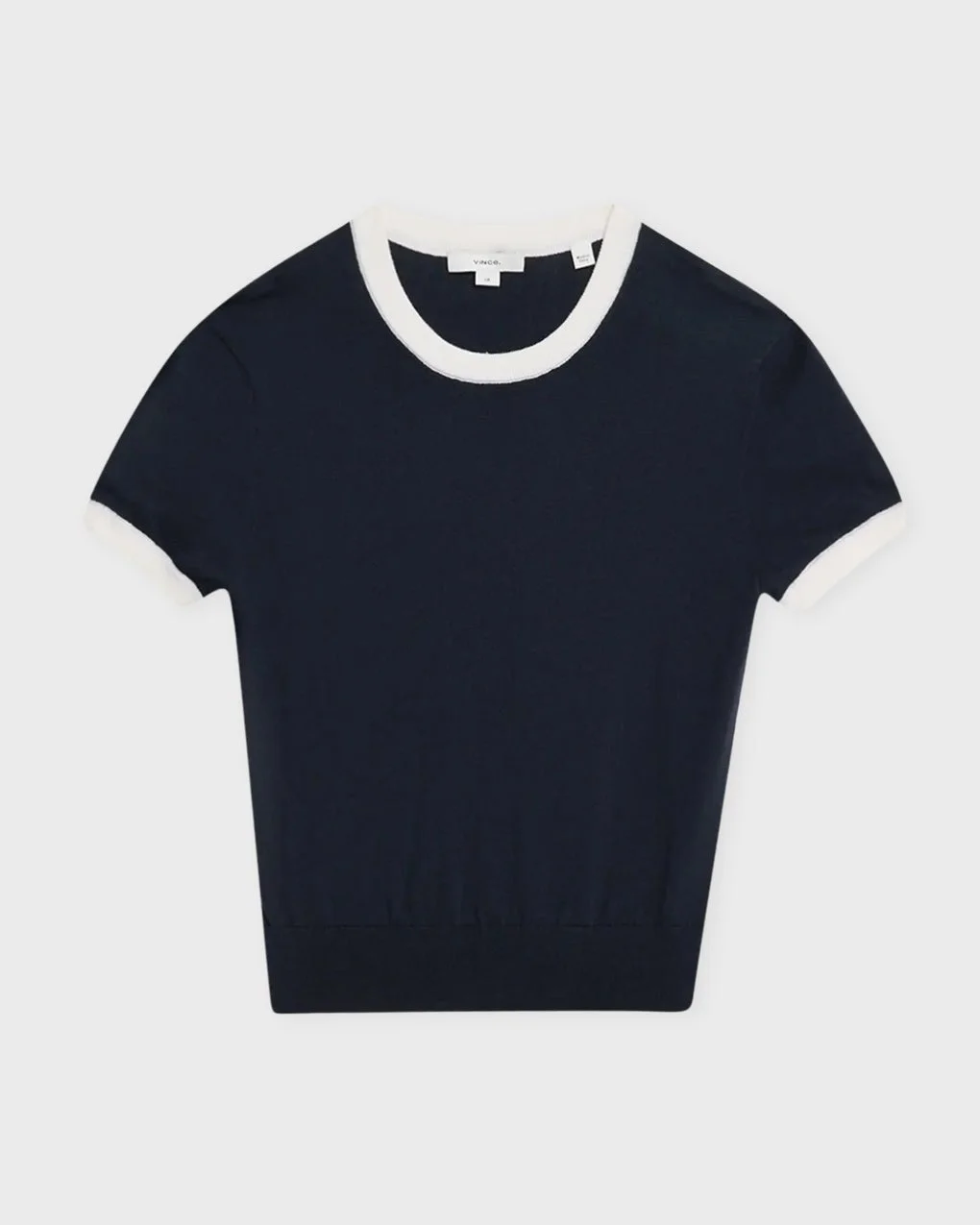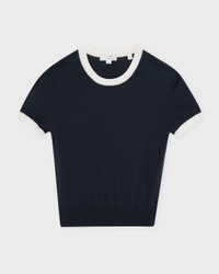 T-shirt Ringer Sweater Tee from Vince. An elegant and sleek knitted t-shirt designed for a relaxed fit. The top features contrasting trim around the crew neckline and armholes. Knitted from a fine yarn in a luxurious, lightweight blend of cotton and cashmere. Size and Fit - Fits true to size, choose your usual size - The model is 172 cm tall and is wearing size S Specification - Article number - ID: 176216-262 - Brand: Vince - Color: Blue/White - Washing Instructions: Hand wash cold - Made of: 84% Cotton, 16% cashmere