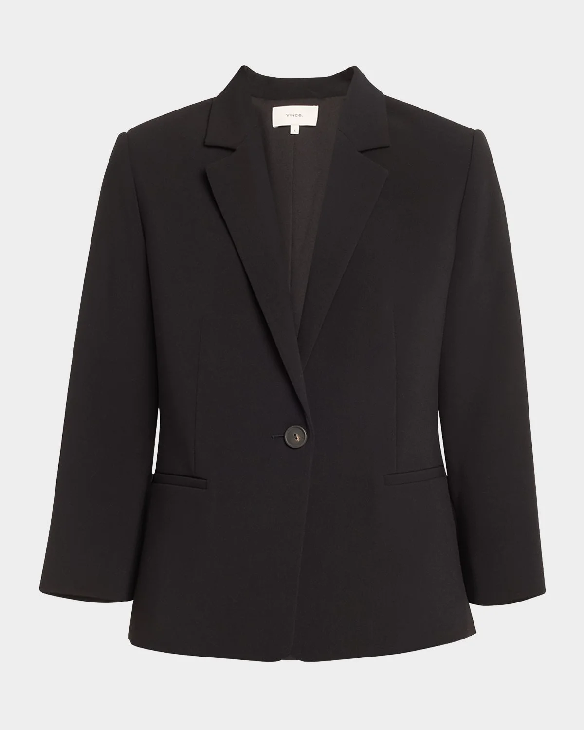 Vince classic blazer complete with twobutton cuffs Notched lapels Bracelet sleeves Front welt pockets Shrunken fit Hip length Singlebutton closure Polyester/viscose/elastane Hand wash, hand wash or dry clean Imported