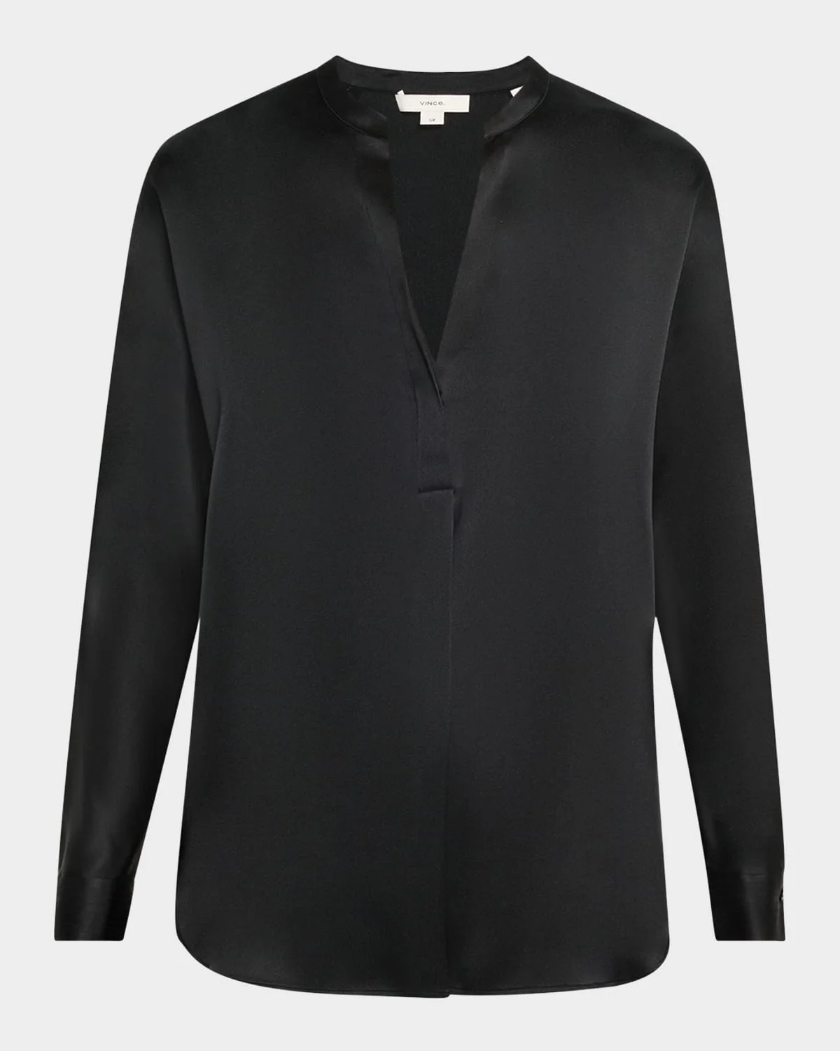 - Vince satin blouse. - V neckline with band collar. - Long sleeves; button cuffs. - Relaxed silhouette. - Shirttail hem. - Pullover style. - Silk. - Imported.