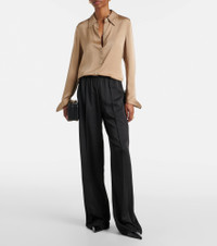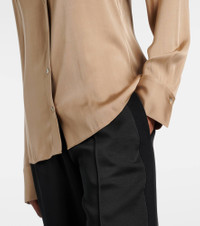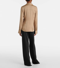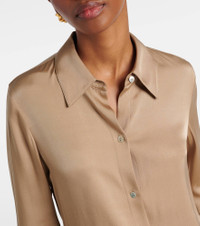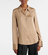 Clean-cut with a subtle sheen, this silk-blend satin shirt from Vince exudes the brand's quiet luxury appeal. This design is finished with wide cuffs, lightly pleated sleeves, and a classic point collar. Product Details - Material: 55% silk, 38% viscose, 7% elastane - Care instructions: hand wash - Made in China - Designer color name: Fawn - Item color: beige - Slim fit - Collar: classic (Straight point) - Closure: buttoned front - Sleeves: long-sleeved - Cuff: buttoned - Hem: rounded - Item number: P01058950 Size & Fit - True to size - Designed for a loose fit - Slightly stretchy fabric - Falls to the hip - The model seen in the picture is 178cm-5'10" and wearing a size XS