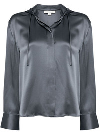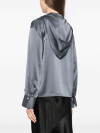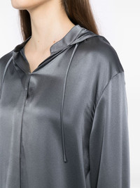 silk hooded shirt Highlights - Lake blue - Silk - Satin finish - Drawstring hood - Concealed front button fastening - Drop shoulder - Long sleeves - Buttoned cuffs - Straight hem Imported Composition Silk 100% SIZE & FIT Model measurements Height 5 ft 10 in(1.77 m) Bust/Chest 27.95 in(71 cm) Hips 34.64 in(88 cm) Waist 22.83 in(58 cm) FittingInformation Designed to be unstructured, offering a loose fit throughout Made from a lightweight non-stretch fabric This piece fits true to size – take your usual size
