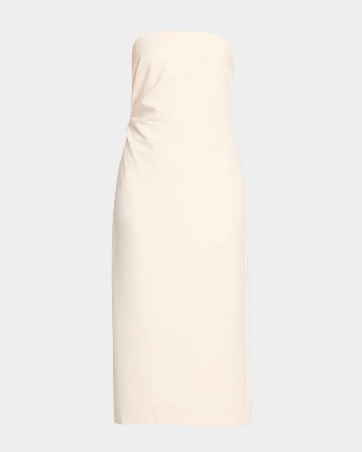 Vince column dress with subtle draping Strapless neckline Sleeveless Back vent Hem falls below the knee Sheath silhouette Invisible back zip closure Polyester/viscose/elastane Imported