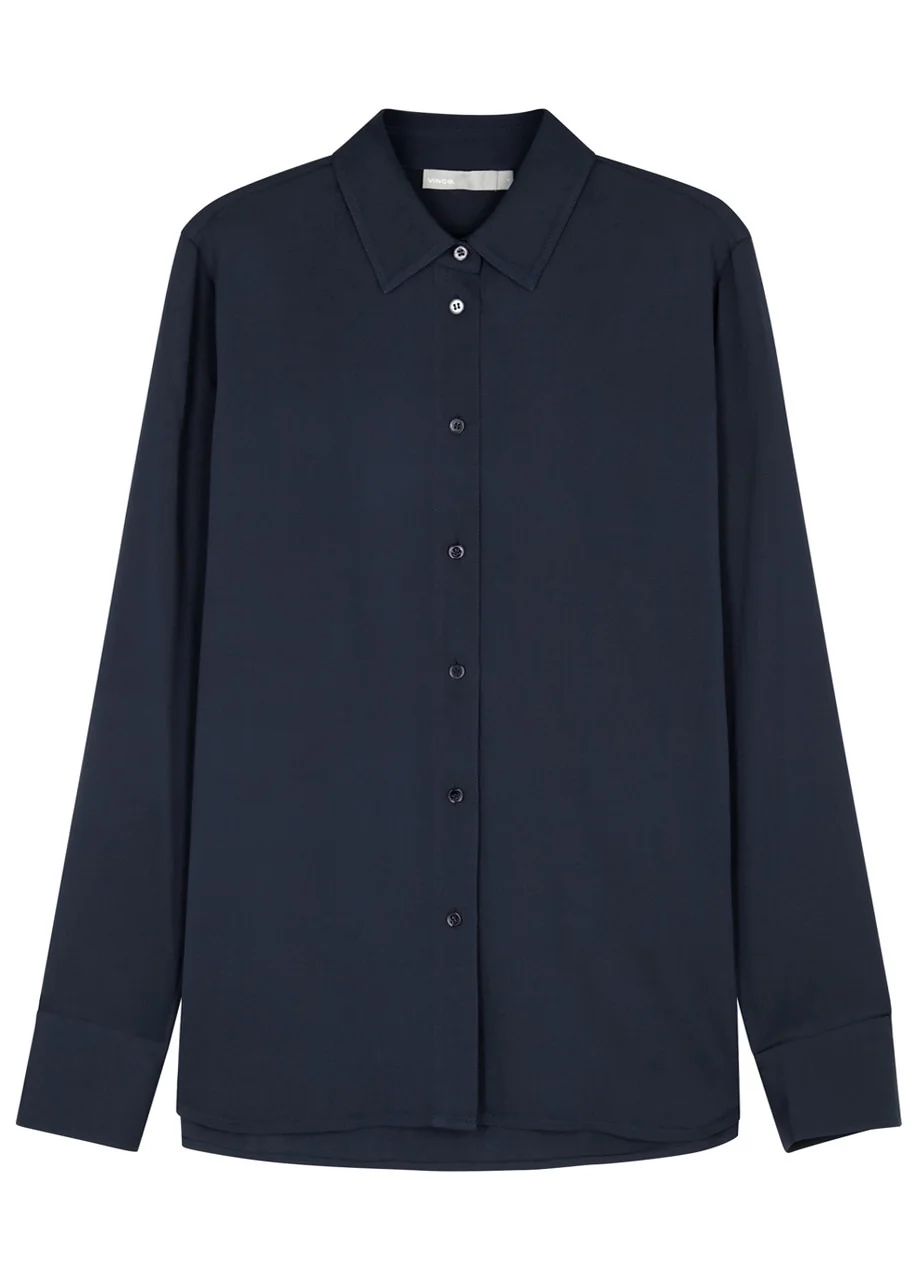 INFO & CARE - Vince stretch-silk shirt - Dropped shoulders button-fastening cuffs box pleat at back curved split sides - Button fastenings through front - 92% silk 8% spandex SIZE & FIT - Hand wash - Length shoulder to hem: 26 inches/ 65cm - Lightweight - Loose fit - Model is 5'8"/ 172cm and wears a size small