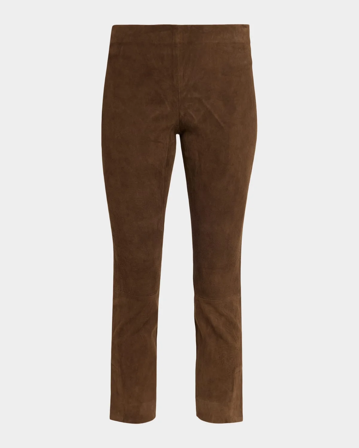 Vince pants in lamb suede with added stretch. Approx. 27"L inseam; 37" outseam. Rise sits at natural waist. Fitted through straight legs. Cropped above ankles. Pullon style. Professional clean only. Imported.
