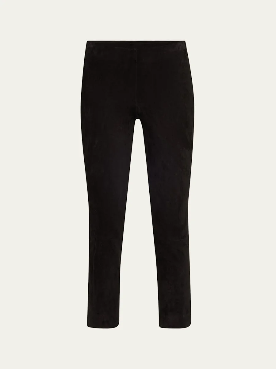Vince pants in lamb suede with added stretch. Approx. 27"L inseam; 37" outseam. Rise sits at natural waist. Fitted through straight legs. Cropped above ankles. Pull-on style. Professional clean only. Imported. Online Inquiries: BGS21_T1HL3| Store Inquiries: #2592229