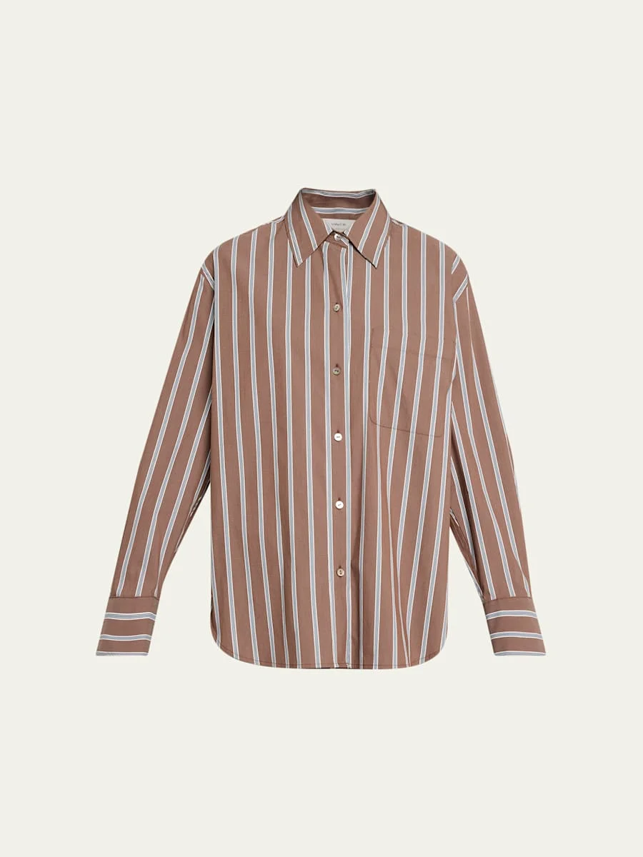 Vince striped shirt crafted from a crisp cottonblend Point collar Dropped shoulders Long sleeves with button cuffs Chest pocket Oversized fit Hem falls to the hip Buttonfront Cotton/nylon/polyamide/elastane Hand wash Imported