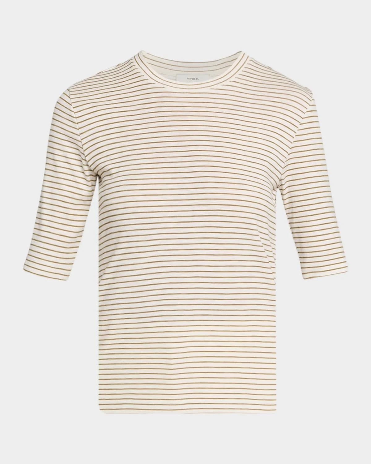 Vince striped knit top & nbsp; Crew neckline Elbow-length sleeves Fitted Hem sits at the hip Pullover style Cotton/modal Dry clean or machine wash cold Imported