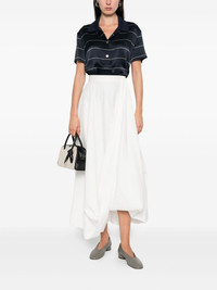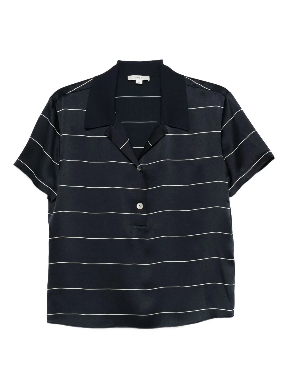 striped short-sleeved top Highlights - Navy blue - Striped pattern - Short sleeves - Collared neckline - Button fastening - Straight hemline Imported Composition Silk 100% SIZE & FIT Model measurements Height 5 ft 10 in(1.78 m) Bust/Chest 33.46 in(85 cm) Hips 36.22 in(92 cm) Waist 23.22 in(59 cm) Washing instructions Hand Wash
