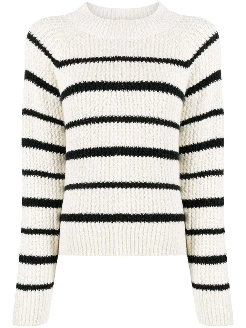 striped ribbed-knit jumper Highlights - Cream white/black - Cotton blend - Ribbed knit - Horizontal stripe pattern - Ribbed trim - Crew neck - Long raglan sleeves Imported Composition Outer: Cotton 83%, Polyamide 17% SIZE & FIT Model measurements Height 5 ft 9 in(1.75 m) Bust/Chest 31.88 in(81 cm) Hips 35.03 in(89 cm) Waist 23.22 in(59 cm) FittingInformation Designed for a slim fit that sits just away from the body offering a close yet comfortable fit Made with a midweight knit, this piece offers some stretch This piece fits true to size – take your usual size