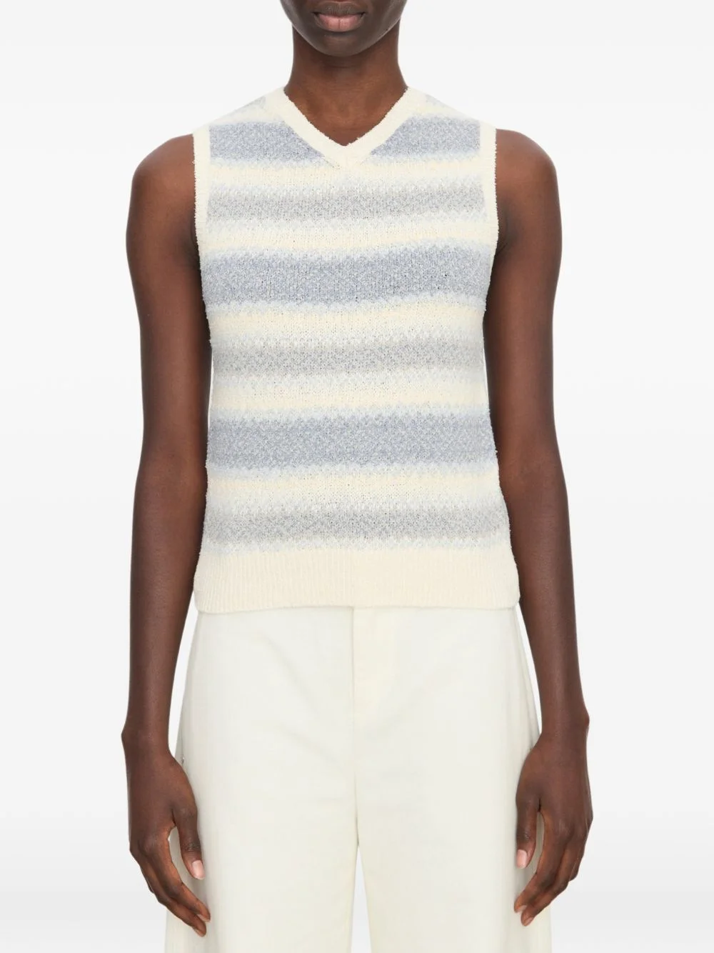 striped V-neck vest Highlights - White and grey - Striped - V-neck - Sleeveless Imported Composition Silk 56%, Nylon 20%, Hemp 11%, Linen/Flax 10%, Other fibres 3% Washing instructions Hand Wash