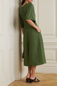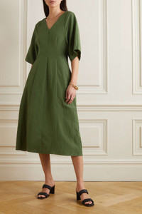 EDITORS'NOTES Vince's dress is the kind you'll rely on for years to come. Designed with an elegant V-neckline and a full skirt, it's blended with plenty of TENCEL™ Lyocell for softness. Complement the green hue with your favorite gold jewelry. SIZE & FIT - Fits true to size, take your normal size - Designed to be fitted at the bust and waist, slightly loose at the hip - Oversized sleeves - Mid-weight, non-stretchy fabric - Model is 177cm/ 5'10" and is wearing a size XSmall DETAILS & CARE - Green TENCEL™ Lyocell-blend - Concealed zip fastening along back - 91% TENCEL™ Lyocell, 9% nylon - Hand wash cold - Designer color: Herb