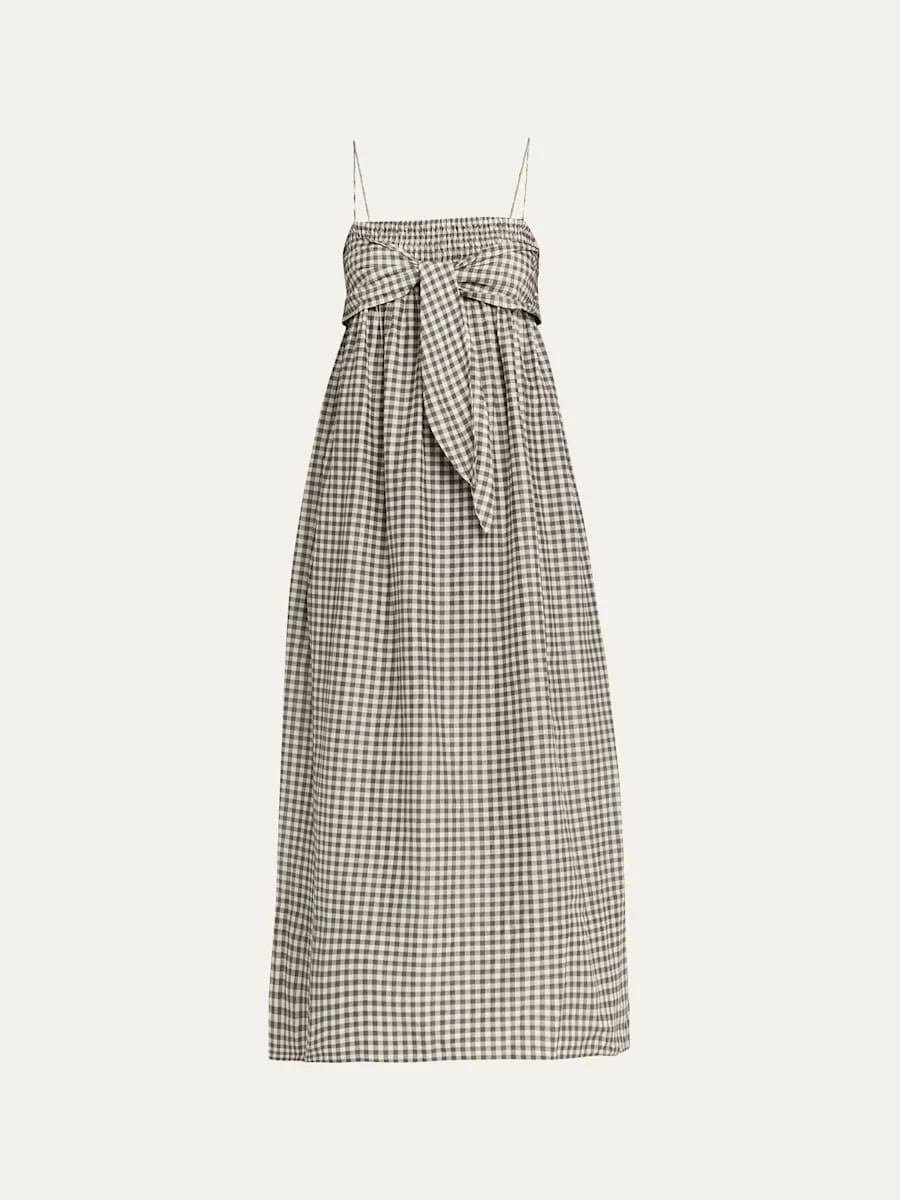 Vince cottonblend midi dress in an allover gingham check Square neckline with selftie Sleeveless Side seam pockets Empire waistline Hem falls below the knee Slipover style Polyester/cotton/spandex Hand wash Imported SIZE amp; FITModel measurements: 5'10" tall Model is wearing a US size 4/Small